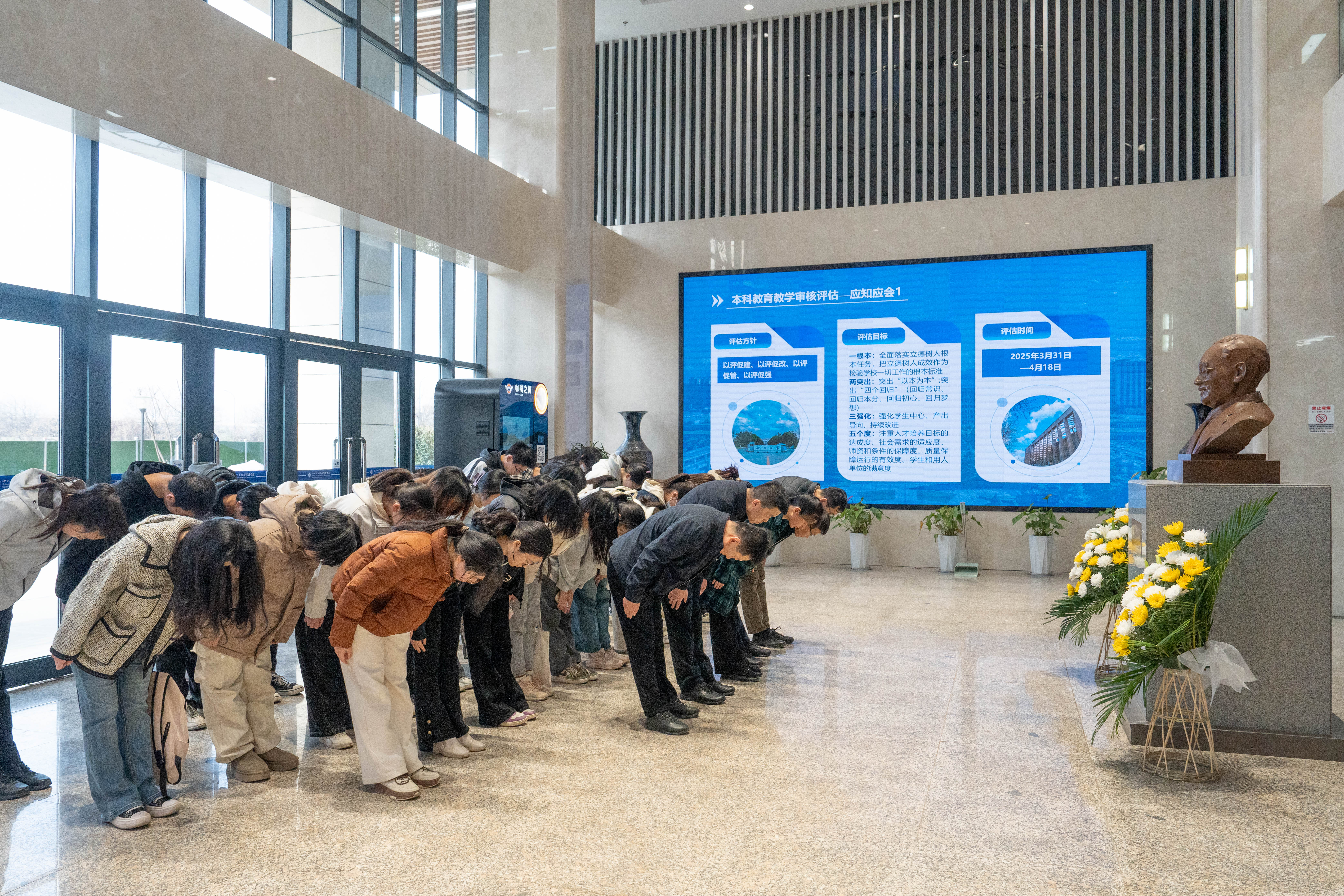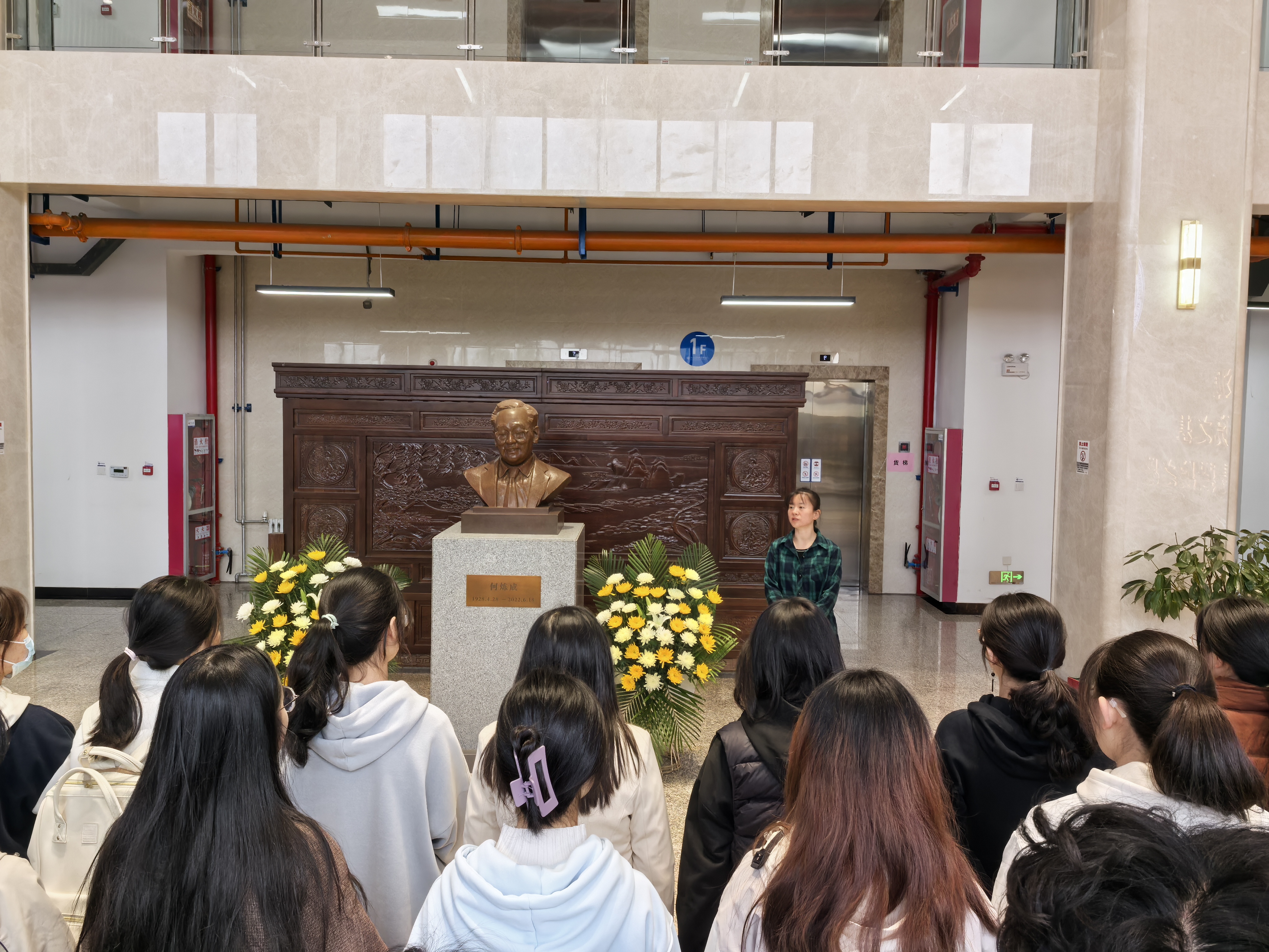 首先,师生们在宏观经济大楼一层大厅何炼成先生塑像前集合,敬献花篮。