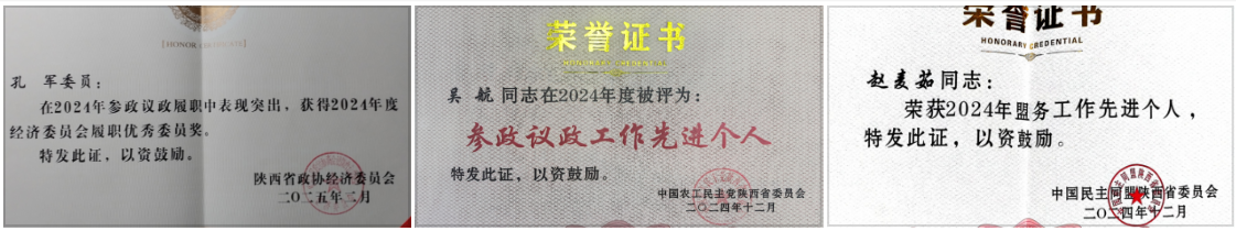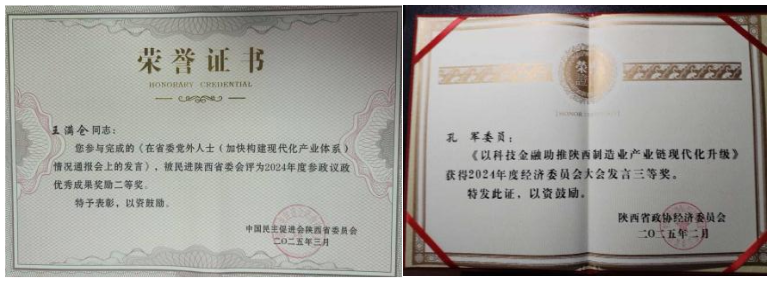 参政议政方面,2024年我院党外人士提交各类提案、议案以及社情民意信息等共29项,其中15项被省级以上部门采纳。西安市人民政府参事、民进会员王满仓参与完成的《在省委党外人士(加快构建现代化产业体系)情况通报会上的发言》被民进省委会评为2024年度参政议政优秀成果奖励二等奖。致公党西大委员会主委孔军《以科技金融助推陕西制造业产业链现代化升级》获得2024年度省政协经济委员会大会发言三等奖。
