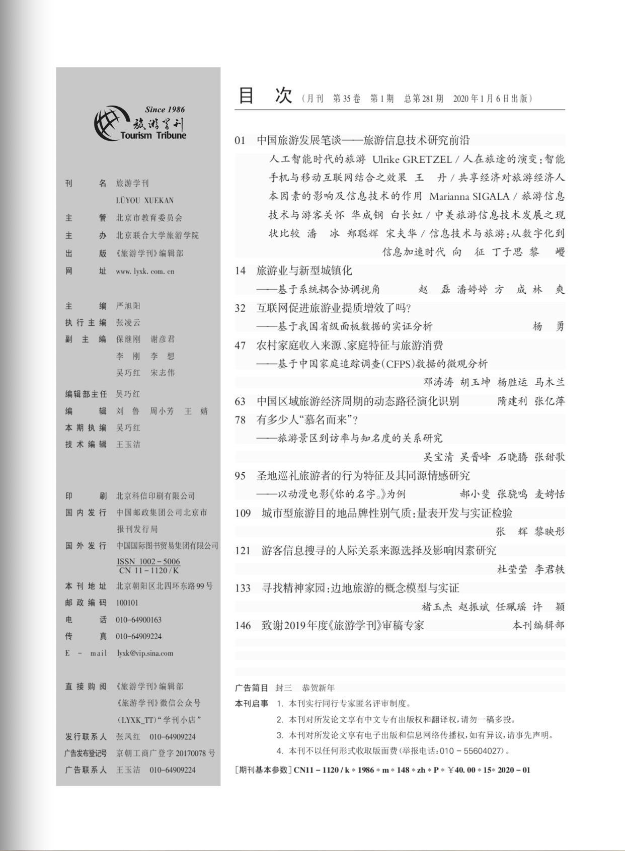 近日,经管院教师褚玉杰与其他院校人员合作撰写的学术论文《寻找精神家园:边地旅游的概念模型与实证》在权威期刊《旅游学刊》2020年第1期发表。