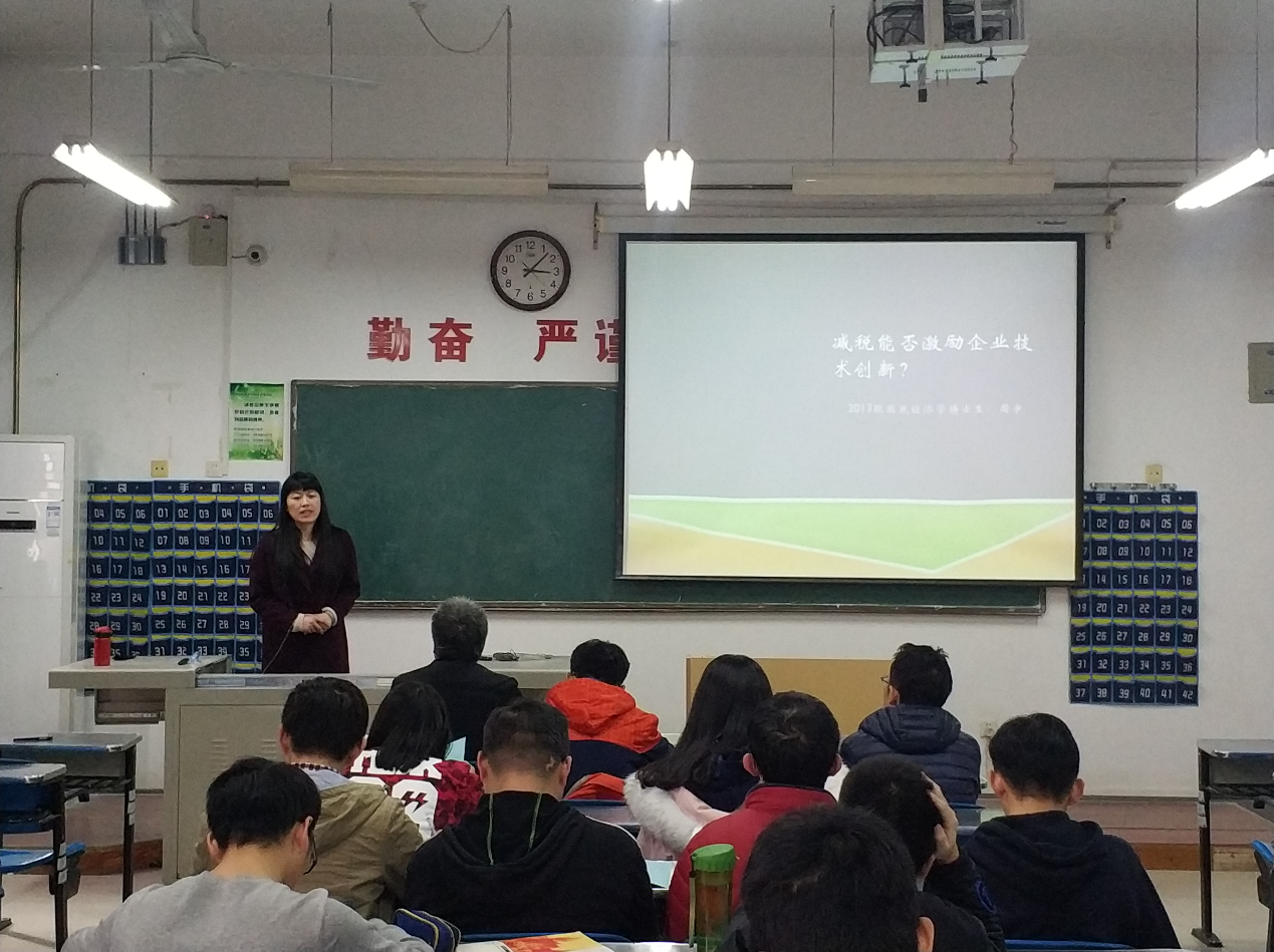 “基地学术课堂”的第一单元为现代经济学理论与方法创新论坛第十三卷第十期,由776net必赢官网周宇博士研究生对题为《减税能否激励企业技术创新?——基于价值链中国工业企业行业异质性的门槛效应分析》的论文进行了报告。该文从工业企业2007年-2014年行业面板数据确定门槛的个数以及模型的形式,进而检验财税政策对企业技术创新的非线性影响。研究发现,减税政策显著地促进了企业技术转换效率和技术转化效率的提升,减税政策具有明显的行业异质性特征。这对制定和实施促进企业技术创新的减税政策乃至具体的减税方案都有一定的指导意义。