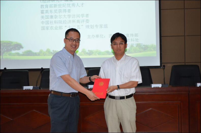 学术报告之前,任保平院长首先对陈彦斌教授的情况做了简要介绍,并主持聘任陈彦斌教授为“西北大学兼职教授”仪式,人事处副处长王思锋教授为陈彦斌教授颁发证书。在学术报告中,陈彦斌教授首先对宏观经济增长理论的核心概念——“宏观政策”的内涵和外延做了准确的界定,提出有别于货币政策和财政政策的狭义宏观调控,中国的“宏观政策”的概念较为宽泛,进而从萧条经济学的视角看宏观政策的理论发展,指出目前围绕宏观政策理论研究,可以进一步关注萧条、贫富差距、家庭与企业债务等问题。
