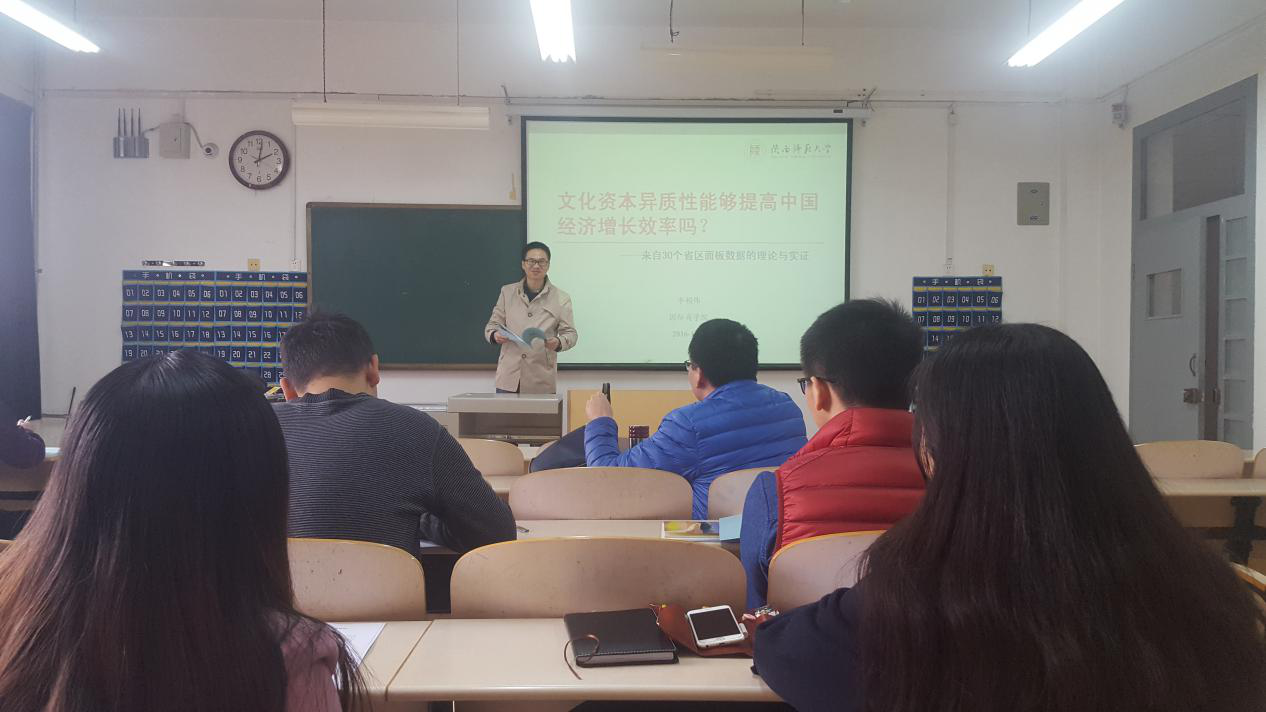 2016年11月9日下午,776net必赢官网现代经济学理论与方法创新论坛第十二卷第六期在长安校区2号楼2310教室成功举行。陕西师范大学国际商学院的李娟伟老师对题为《文化资本异质性能够提高中国经济增长效率吗?——来自30个省区面板数据的理论与实证》的学术论文进行了汇报。报告由会计学系李辉老师主持,博硕士和本科生二十余人参加了本次讨论。
