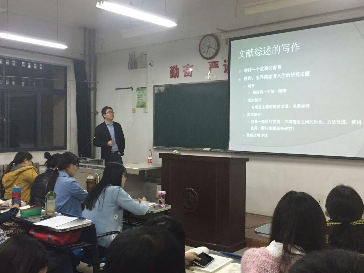 10月26日研究生学术月讲座第五讲在长安校区1309教室举行。李娟伟博士应邀做题为《经济学的写作方法》的报告,他从选题来源问题、研究方法、写作思路、写作重点与难点和写作态度五方面来展开自己的观点,和学生进行了交流。