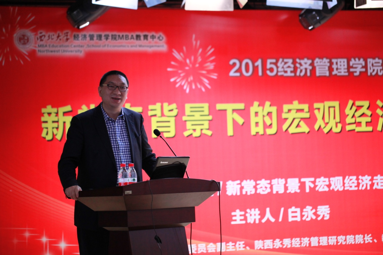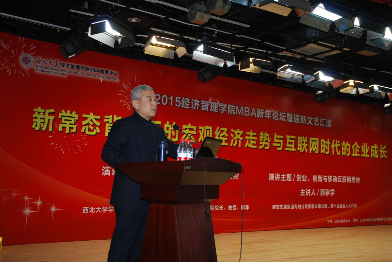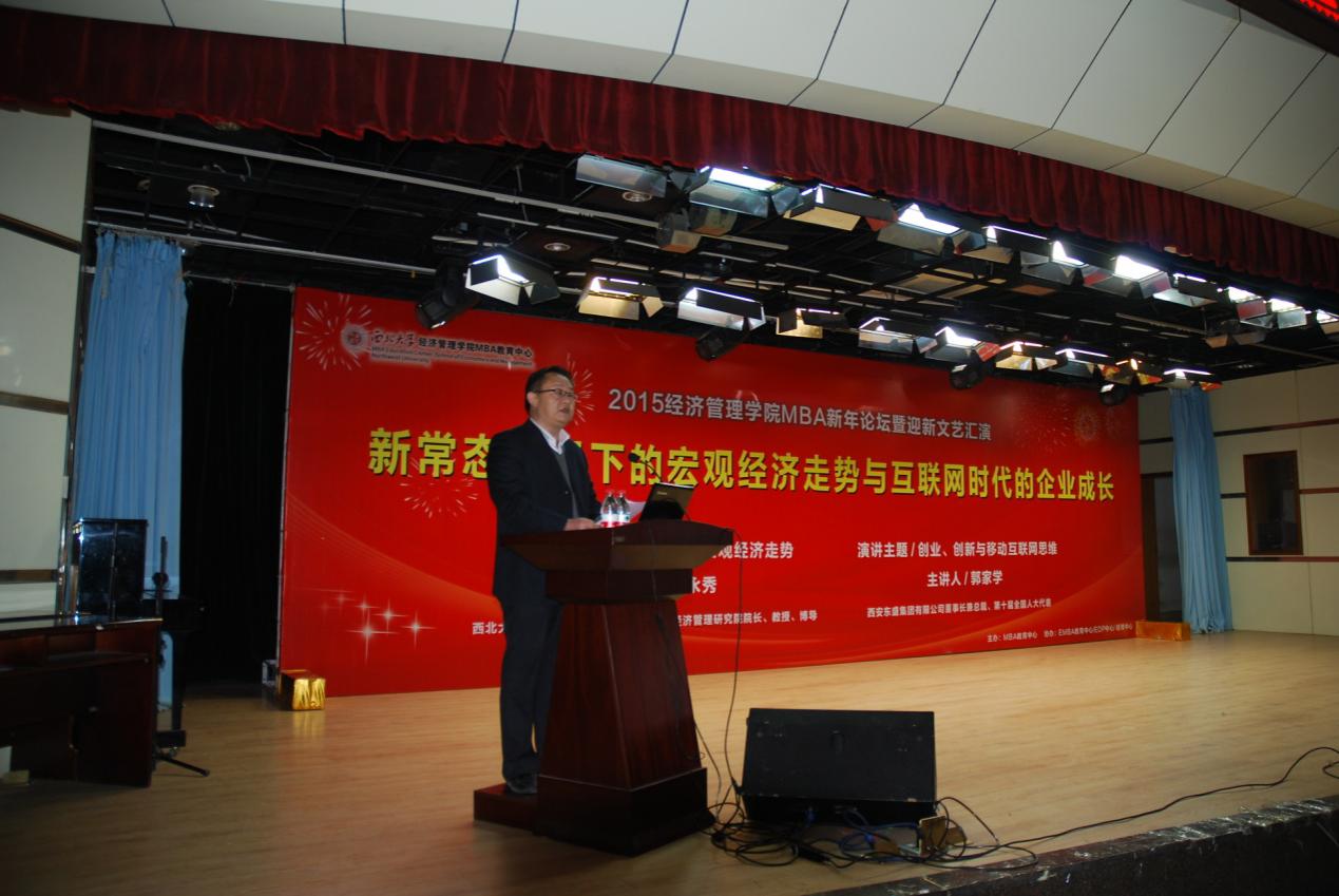 2015年1月18日,由MBA教育中心主办,EMBA教育中心、高级管理培训中心、硕博中心协办的2015年MBA新年论坛在长安校区多功能报告厅举行。本次论坛邀请白永秀教授、西北大学MBA杰出校友、西安东盛集团有限公司董事长郭家学围绕“新常态背景下宏观经济走势和移动互联时代企业成长”的主题做了精彩演讲,院长任保平教授主持论坛。出席论坛的还有MBA联合会代表、EMBA联合会代表、学院教师以及MBA、EMBA学员共400余人。