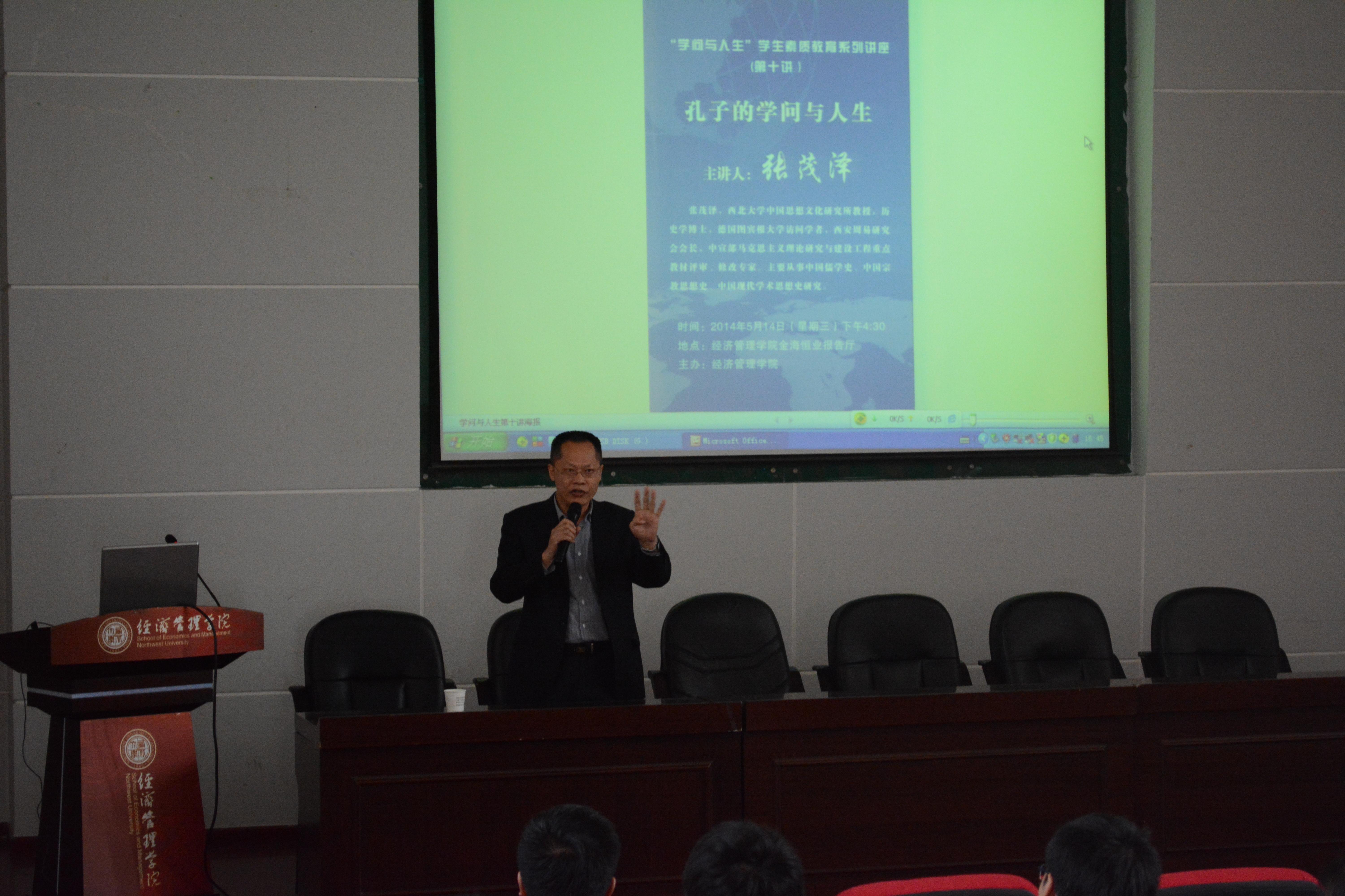 讲座中,张茂泽教授从“学问与人生的关系”和“孔子如何看待学问与人生”这两部分对学问与人生的主题进行了阐述,深入浅出的分析介绍了关于学问与人生关系的两种观点:一是传统古代中国所赞同的——为学与为人一致的观点;二是近代西方所赞同的——为学与为人割裂的观点。随后,张教授提出了儒学即人学的观点,号召大家体味学问与人生,努力成为好学生,理想的学生,多读经典,通过儒学思想的学习来提高学问,提升境界,实现学问与人生的统一。