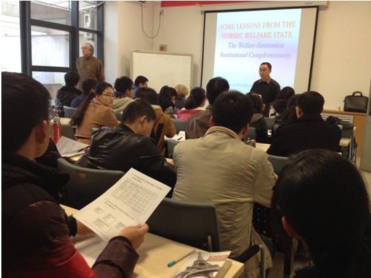2013年11月27日下午,经管学院高端专家短期教学系列讲座在长安校区8202教室举行。法国经济学调节学派代表人物Robert Boyer教授做了题为“来自北欧福利国家的经验教训”(Some lessons from the Nordic welfare states)的学术报告。我院经济学博士、硕士及部分教师聆听了报告。报告会由院长助理师博副教授主持。