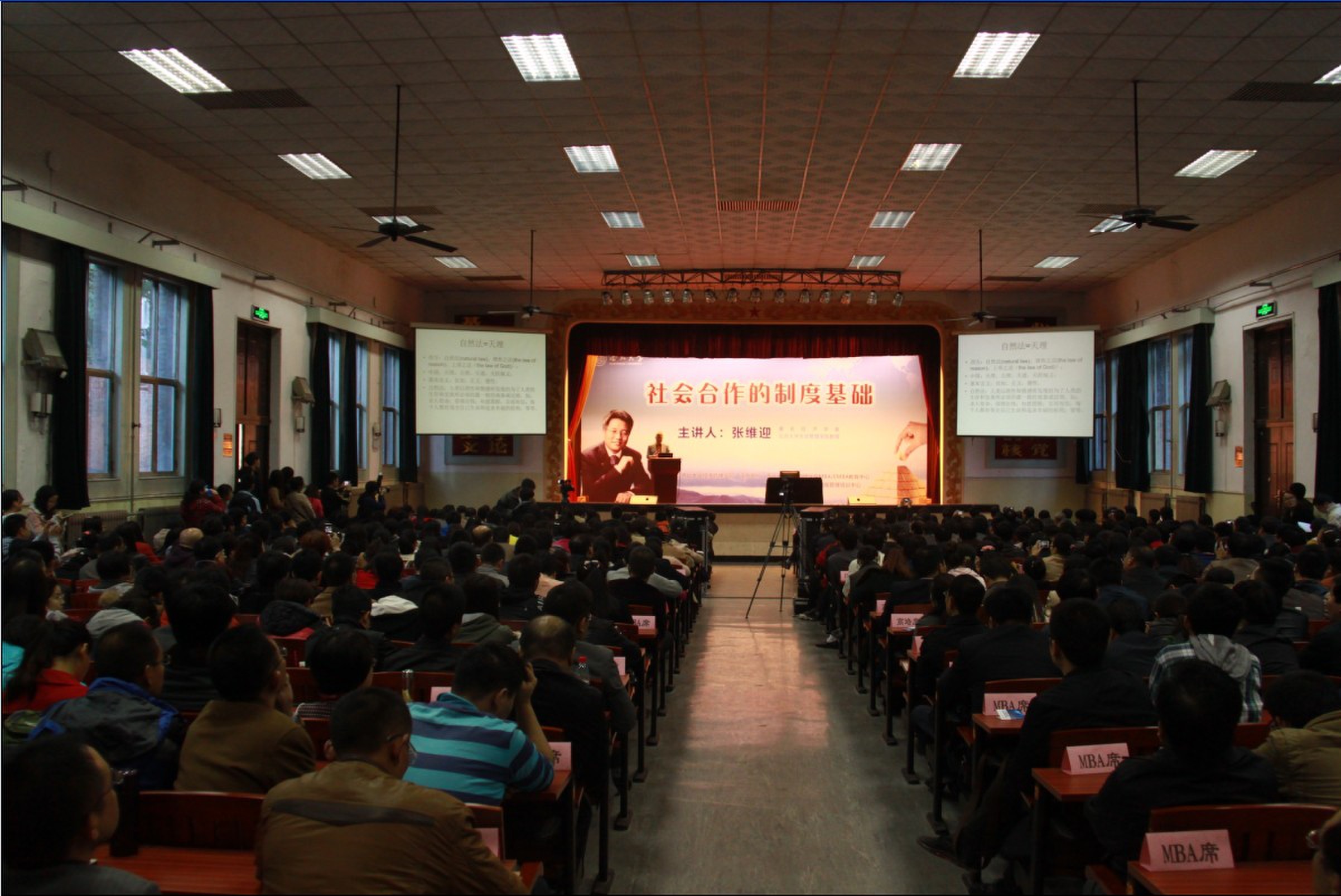 11月1日下午,经管学院“关中大讲堂”系列讲座之十四暨776net必赢官网第七届研究生学术月专家学术报告之八在太白校区大礼堂举行。我校杰出校友、著名经济学家、北京大学光华管理学院教授张维迎应邀作了了题为《人类合作的制度基础》的学术报告。我校部分教师、MBA和EMBA及科学学位研究生600余聆听了报告。报告会由776net必赢官网院长任保平教授主持。