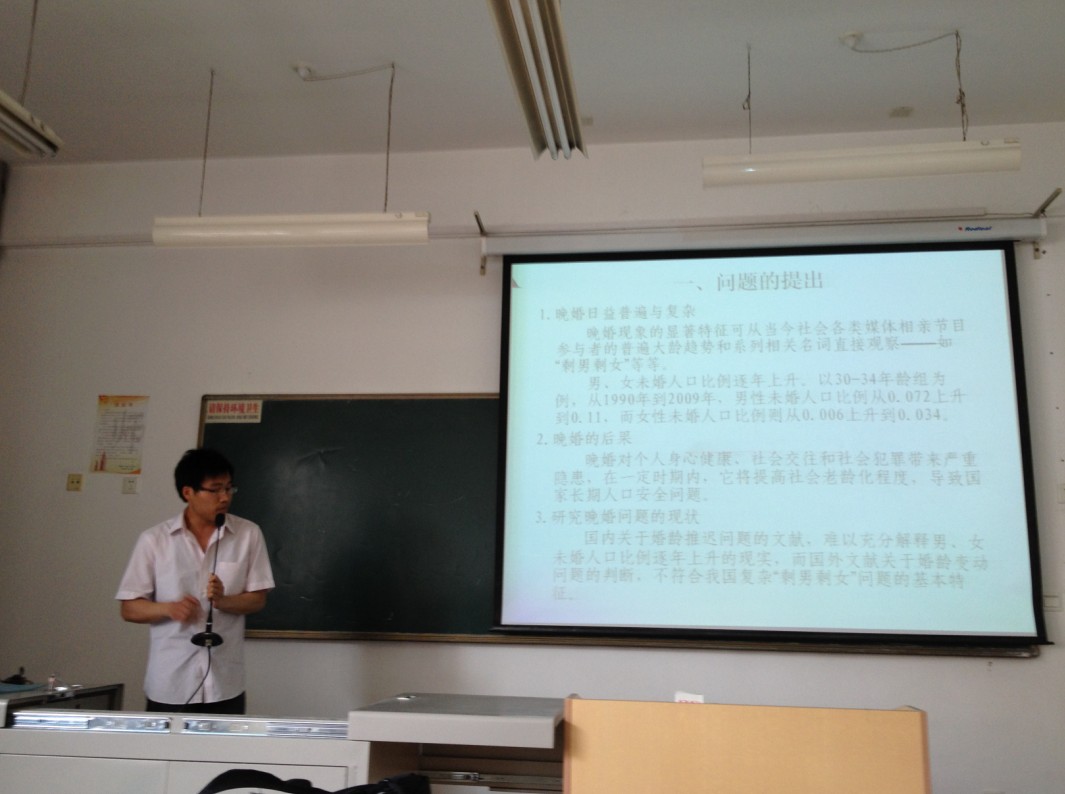 由学院经济学系主办的“现代经济学理论与方法创新论坛”第八卷第十二期5月9日下午2点在学校1305教室举行。此次论坛的主讲人为学院2009级政治经济学博士生江涛,题目为“中国性别结构失衡、搜寻匹配和晚婚现象:理论与实证”。 此次论坛由学院经济学系刘瑞明副教授主持,李勇博士进行点评。