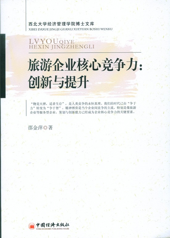 近日,我院旅游管理系教师邵金萍博士的著作《旅游企业核心竞争力:创新与提升》由中国经济出版社出版发行,为我院资助出版的16本“776net必赢官网博士文库”系列丛书之一。该书在其博士论文的理论框架下,概括了作者近年来在旅游企业核心竞争力问题上的最新研究成果,是继她与杨永平副教授的合著《旅游企业核心竞争力》出版后的又一新著。