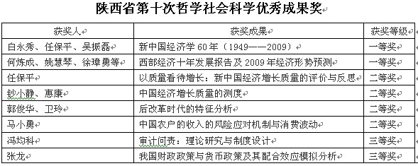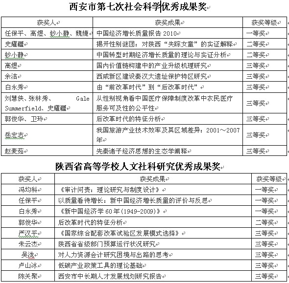 经过努力,我院2011年科研工作成绩喜人。一是科研获奖数量有所增加,获奖层次不断提高。经统计,全院一年共获各类科研奖励35项,其中省部级19项、厅局级9项、其他7项。有代表性的获奖是:何炼成、姚惠琴等《西部经济十年发展报告及2009年经济形势预测》、白永秀、任保平的《新中国经济学60年(1949-2009)》获陕西省第十次哲学社会科学优秀成果一等奖;任保平等的《中国经济增长质量报告2010》获西安市第七次社科优秀成果一等奖;任保平的《以质量看待增长:新中国经济增长质量的评价与反思》、郭俊华的《后改革时代的特征分析》、钞小静的《中国经济增长质量的测度》陕西省第十次哲学社会科学优秀成果奖二等奖;白永秀、任保平等的《以西安为中心的关中城市群研究》获陕西省科学技术奖二等奖。