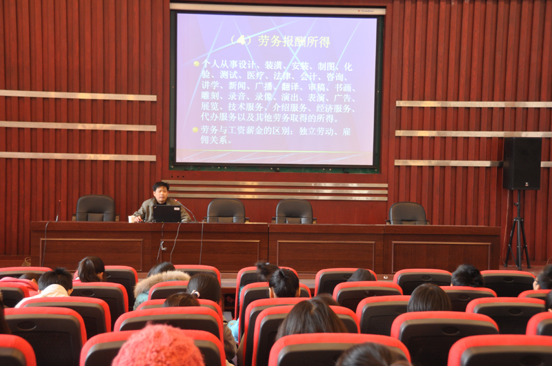 2010年12月15日下午2点,陕西省地税局所得税管理处董天学处长应邀在金海报告厅为我院学生做了题为《个人所得税基本原理》的专题报告。报告会由我院会计专业系主任张晓明教授主持,150余名会计系学生参加。