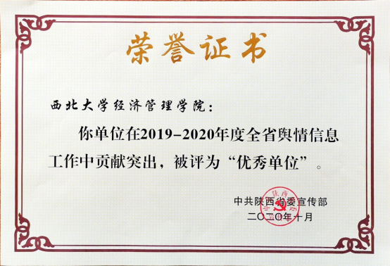 日前,省委宣传部对2019-2020年全省舆情信息工作进行了表彰,我院和陕西宏观经济与经济增长质量协同创新研究中心被评为“优秀单位”,我院2018级金融学硕士研究生胡英姿被评为“优秀个人”,我院报送的《关于新冠肺炎疫情对我省经济的影响及对策的专题智库报告》获评“优秀稿件”。