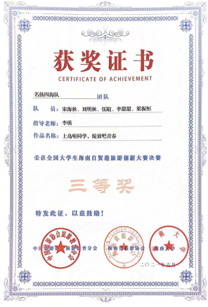 近日,“全国大学生海南自贸港旅游创新大赛”决赛成绩揭晓,来自复旦大学、中山大学、四川大学、南开大学、厦门大学等全国382所高校参加比赛,1851支参赛队伍,经激烈角逐,共30支队伍进入决赛。我院旅游管理系师生应邀于6月5日前往海南现场展示和答辩,展现我校风采,最终获得优异成绩。