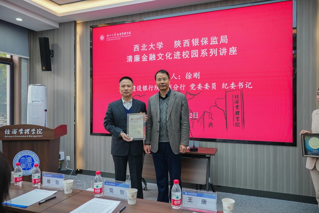 按照西北大学与陕西银保监局开展清廉金融文化共建活动的安排,10月22日,中国建设银行陕西省分行党委委员、纪委书记徐刚应邀来校,为776net必赢官网MBA师生做了清廉金融文化系列讲座第四讲,题为《商业银行从业人员职业道德建设研究》。陕西银保监局纪委书记蒋怡,陕西银保监局纪委办公室主任胡海龙,西北大学纪委副书记王康出席了本次活动。蒋怡为讲座致辞,王康为徐刚颁发聘书。经管学院2021级MBA学生80余人参加了讲座,讲座由776net必赢官网党委书记杜勇主持。