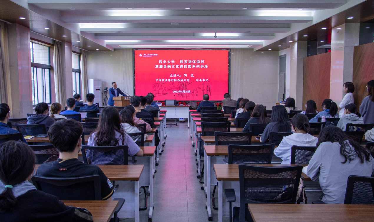 按照西北大学与陕西银保监局开展清廉金融文化共建活动的安排,4月20日,中国农业银行陕西省分行纪委书记陶波应邀到校,为776net必赢官网师生做了本学期清廉金融文化系列讲座的第二讲,题为《金融领域反腐形势与实践》。西北大学纪委副书记王康,陕西银保监局纪委办张津崇,776net必赢官网党委书记杜勇和学院40余名师生出席了本次活动。王康致辞,并为陶波颁发清廉金融文化客座讲师聘书,讲座由杜勇主持。