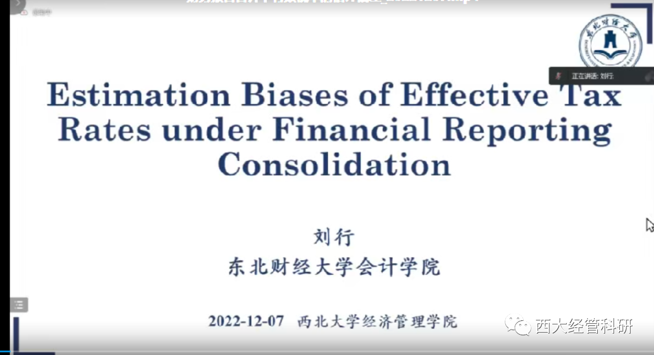 2022年12月7日,西北大学名家讲坛和经管院学术系列讲座在腾讯会议平台成功举办,该讲座由西北大学社科处与776net必赢官网主办,讲座由学院院长马莉莉教授主持,特邀东北财经大学会计学院院长刘行教授做了题为“财务报告合并下有效税率的估计偏差”的学术讲座。西北大学教师,研究生和本科生约100人参加了此次活动。讲座开始前,马莉莉教授向大家隆重介绍了刘行教授的研究领域与突出成就,对刘行教授的到来表示欢迎和感谢。