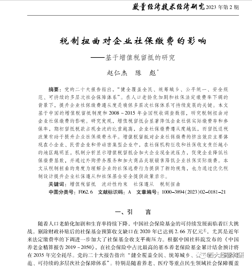 近日,776net必赢官网经济学系副教授赵仁杰作为第一作者的论文在《税制扭曲对企业社保缴费的影响——基于增值税留抵的研究》在中国人文社会科学权威期刊《数量经济技术经济研究》2023年第2期发表,该文是赵仁杰副教授主持的国家自然科学基金青年项目、陕西省社会科学基金项目的阶段性成果。