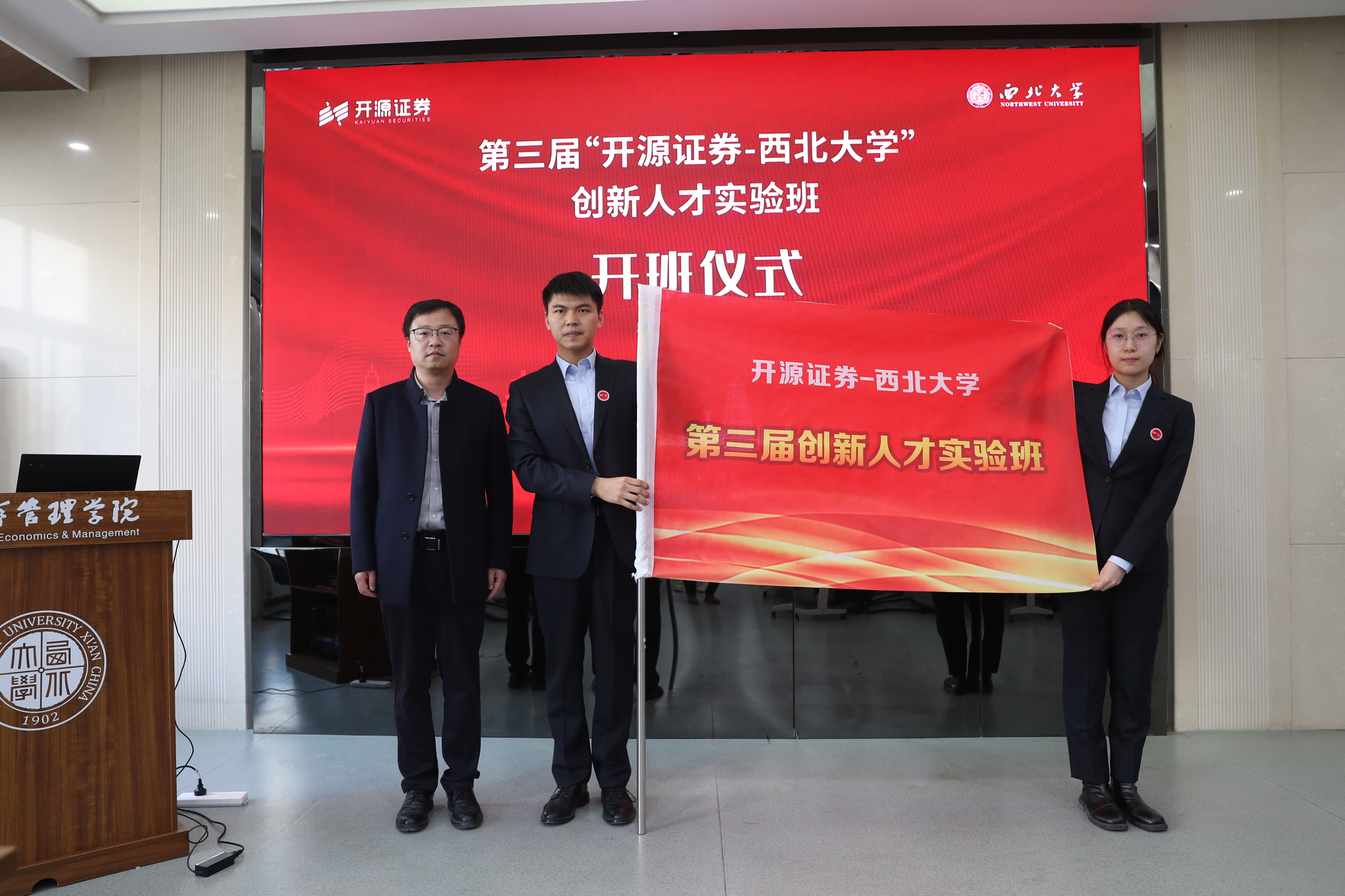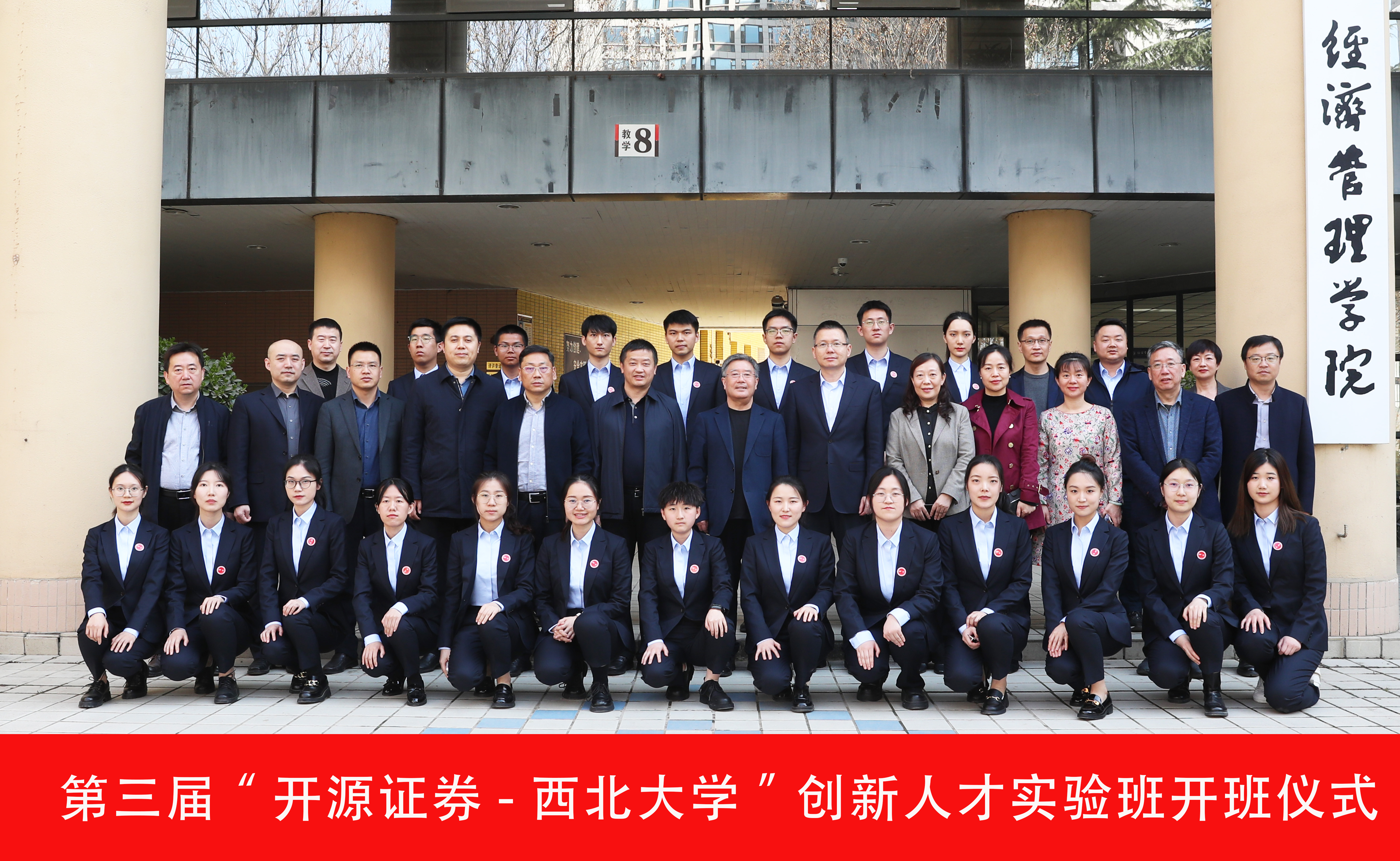 3月8日下午,第三届“开源证券-西北大学”创新人才实验班开班仪式在我院举行。第三届实验班全体学员,开源证券董事长李刚、总经理助理张国松、李青,招商银行西安分行副行长李凯,我校校长郭立宏,教务处处长曹蓉、国内合作与校友工作处处长崔延力、学生工作部副部长赵金哲、研究生院副院长寇楠、学院院长马莉莉及学院班子成员共40余人参加了开班仪式。仪式由学院党委书记杜勇主持。