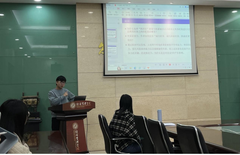 报告伊始,杨欣怡同学从理论分析、研究设计、实证结果、机制检验和拓展研究等方面对文章进行汇报。通过使用2000—2021年沪深A股上市公司的数据,以“两控区”政策和低碳城市试点政策为准自然实验,采用多时点双重差分法考察减污和降碳政策对微观企业绿色转型的影响及作用机制。