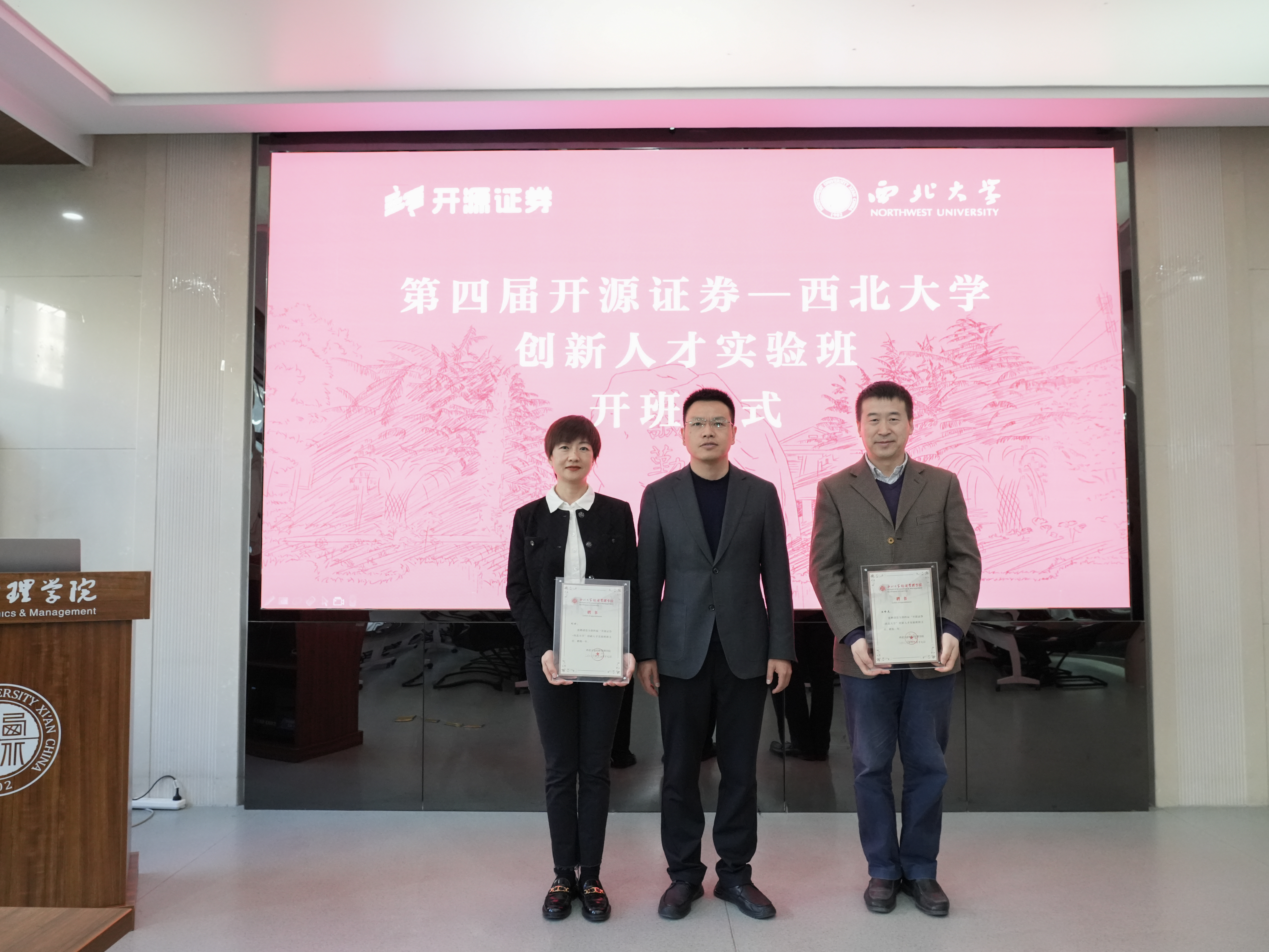 开班仪式上,张国松为实验班班主任王峰虎、刘云颁发班主任聘书。李青为第四届“开源证券-西北大学”创新人才实验班授旗。学生杨晨誉作为本届实验班学员代表发言。