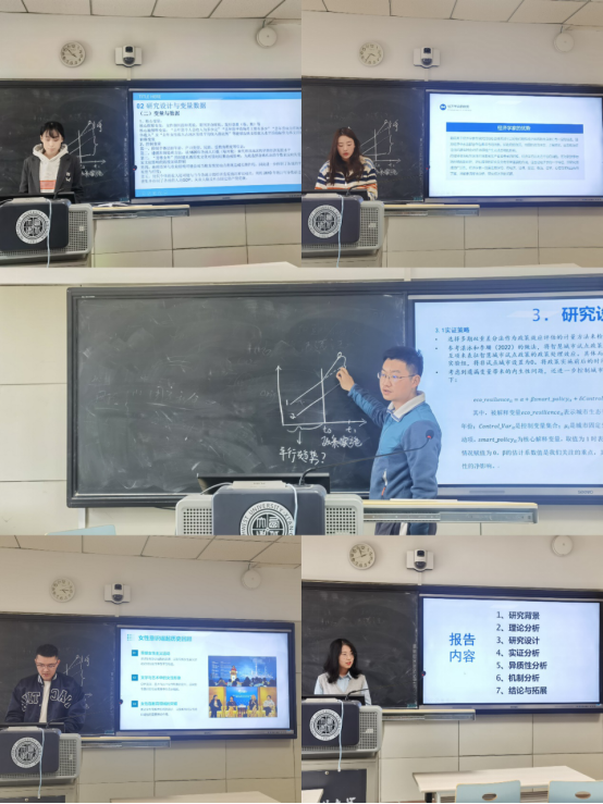 “基地学术课堂”的第一单元为现代经济学理论与方法创新论坛第二十一卷第五期,由2022级理论经济学专业硕士研究生李楠进行了题为《数字化治理对城市生态韧性的效应评估》的报告。基于2006—2021年中国289个城市的面板数据,通过构建多期双重差分模型,系统考察了数字化治理对城市生态韧性的影响及作用机制。