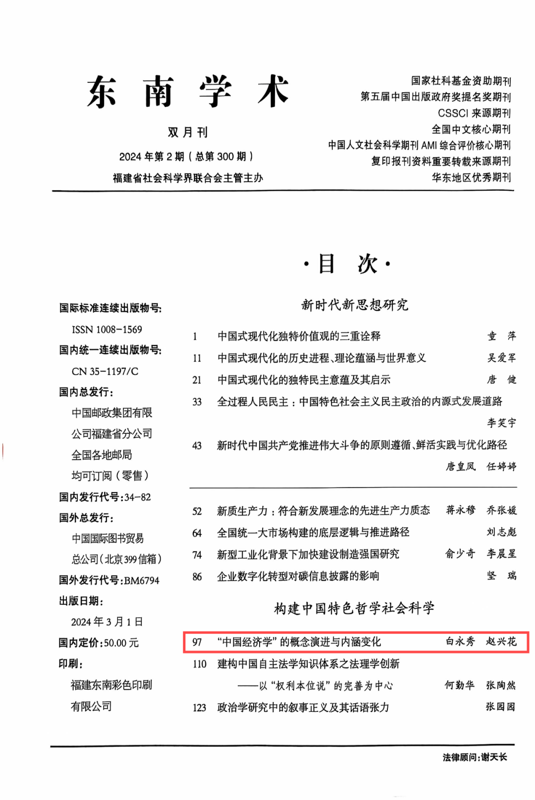 我院博士生导师白永秀教授与博士生赵兴花合作发表的论文《“中国经济学”的概念演进与内涵变化》(原载于《东南学术》2024年第2期)被《新华文摘》2024年第18期全文转载。