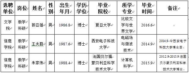 2015年12月10日上午08:30-11:30,我院在长安校区经管学院8号楼一层会议室,召开了选聘博士生试讲面试会议。面试小组由学校人事处委派的教学督导和我院相关专家组成。面试小组通过试讲、答辩及综合能力考察,结合我院近年来学科发展的重点,以及专业的需要,面试小组同意选聘以下5名博士毕业生来校任教。现将本次拟选聘人员基本情况公示如下(公示期3天):