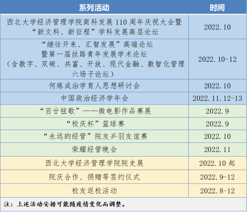 2022年是西北大学成立120周年、商科创建110周年,为了全面展示学院办学成果,增强师生和校友的凝聚力与自豪感,激励广大师生携手共赴学院“双一流”学科建设新征程,兹定于2022年10-12月举行776net必赢官网商科发展110周年庆系列活动(详见附表)。