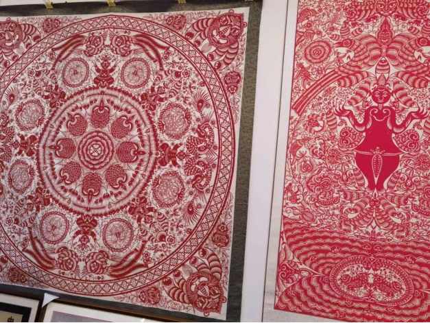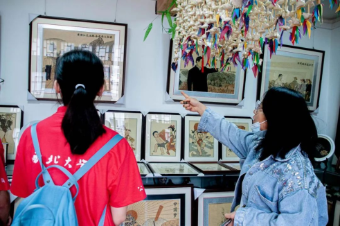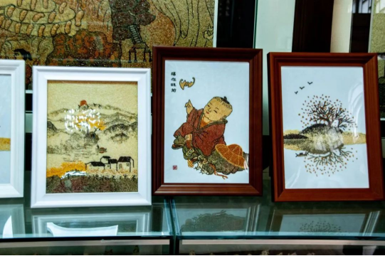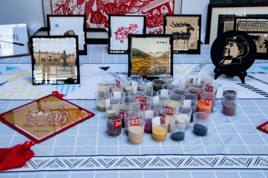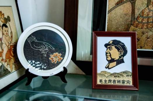 在榆林当地流传着这样一句方言:“米脂的婆姨绥德的汉”,队员们初到米脂并不明白这句话的意思,当看到第一展览室内的米贴画和剪纸时,心中的疑惑被一下子解开,无论是小米贴画还是剪纸,工序的繁琐不言而喻,可一幅幅精巧别致的成品却能够栩栩如生地展现在参观者面前,据工作人员讲解:“这些小米贴画大多是由农村留守妇女、脱贫户制作,种类有摆件、挂件、纪念品等,销往全国各个地区,产销两旺。”