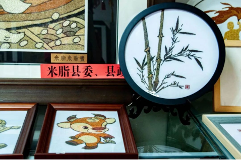 米脂小米,除了可以制作成各色小吃,还可以怎么利用呢?在米脂婆姨手中,小米不仅可以是食材,还可以是作画的原料。据了解,米贴画和剪纸为当地的百姓提供了新的就业机会,能够留住年轻人为家乡的发展出力出策。2022年以来,米脂县先后举办两次米贴画培训班,愿意长期从事米贴画制作的米脂婆姨留在工坊工作,赚取收入提高家庭生活水平。有不少制作者是年轻宝妈,在把孩子送进学校和接孩子放学之间的这段空闲时间,她们争分夺秒赶到工坊上班,推动米贴画融入全域旅游发展中。摆件、挂件、背景挂画等手工艺品已成为当地的名片,通过线上线下渠道进行出售。据负责人介绍,好的作品价格高达五六千,以手工艺品为载体,传承传统手工艺,带领更多的群众增收致富。