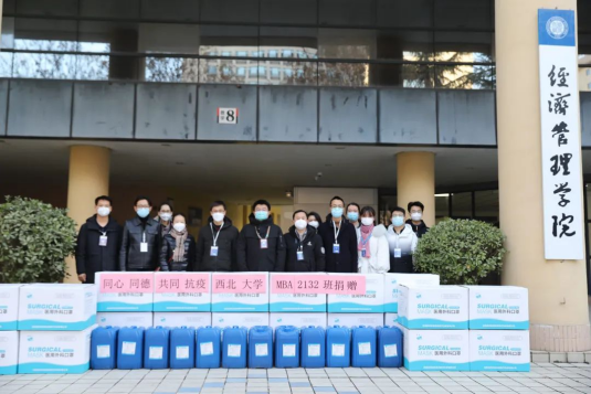 12月31日,在西北大学MBA2132班班委的积极组织下,班级同学向西北大学捐赠一次性医疗口罩50000只、25KG酒精12桶,用拳拳赤子真情表达对学校的牵挂,为学校疫情防控工作贡献力量。西北大学党委常委、副校长、776net必赢官网院长吴振磊,776net必赢官网党委副书记徐自成,学校国内合作处副处长燕来及学院部分学生干部出席了捐赠仪式。