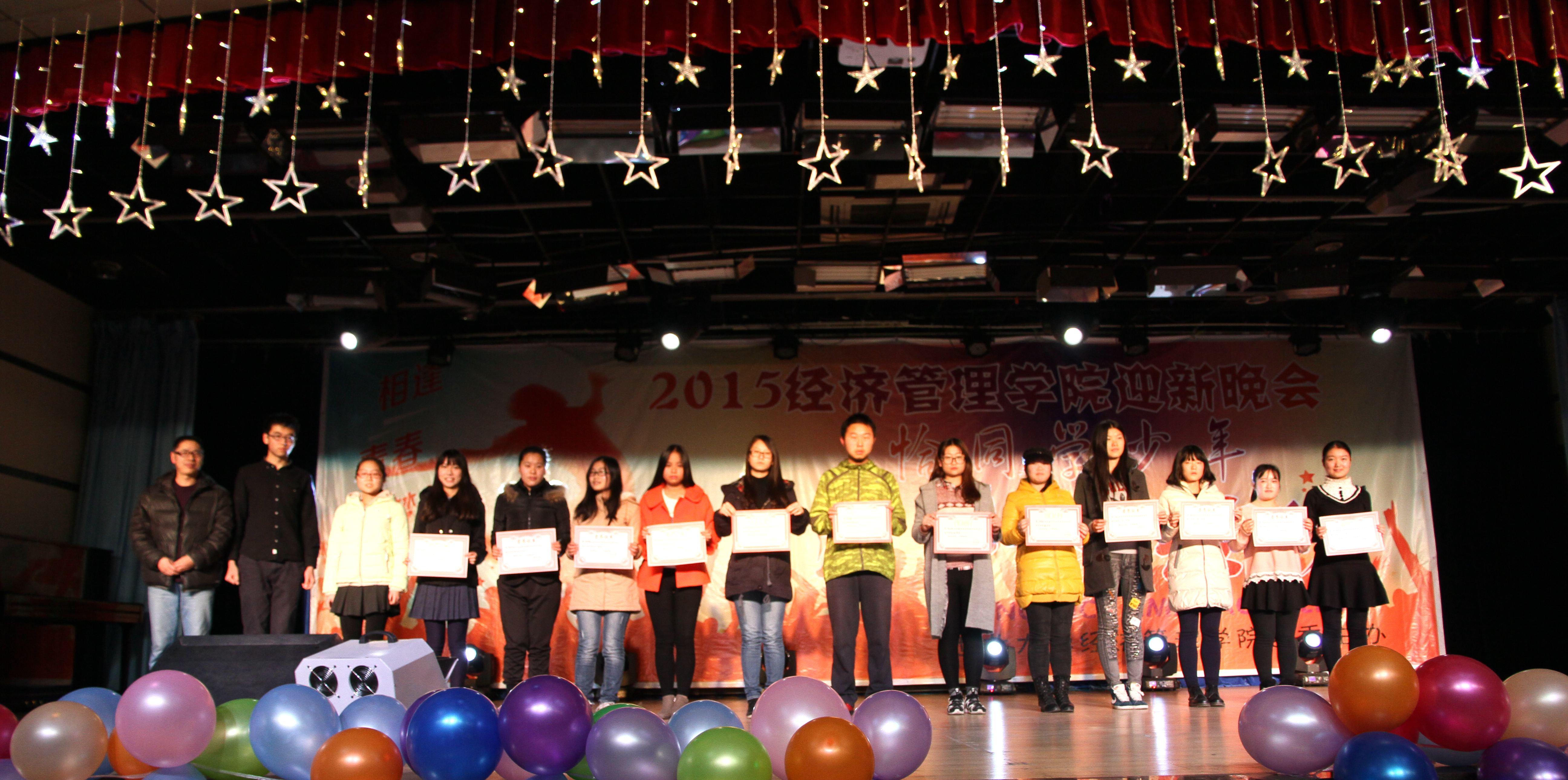 在晚会过程中,学院还对2015年新生系列活动进行了隆重的总结表彰,2015级新生入学以来,院团委精心组织了形式多样的入学教育和新生系列活动,包括安全教育、新老生交流会、新生宿舍风采大赛、新生体育系列活动及运动会、新生辩论赛、新生演讲和主持大赛等,帮助2015级新生尽快的适应大学学习生活。