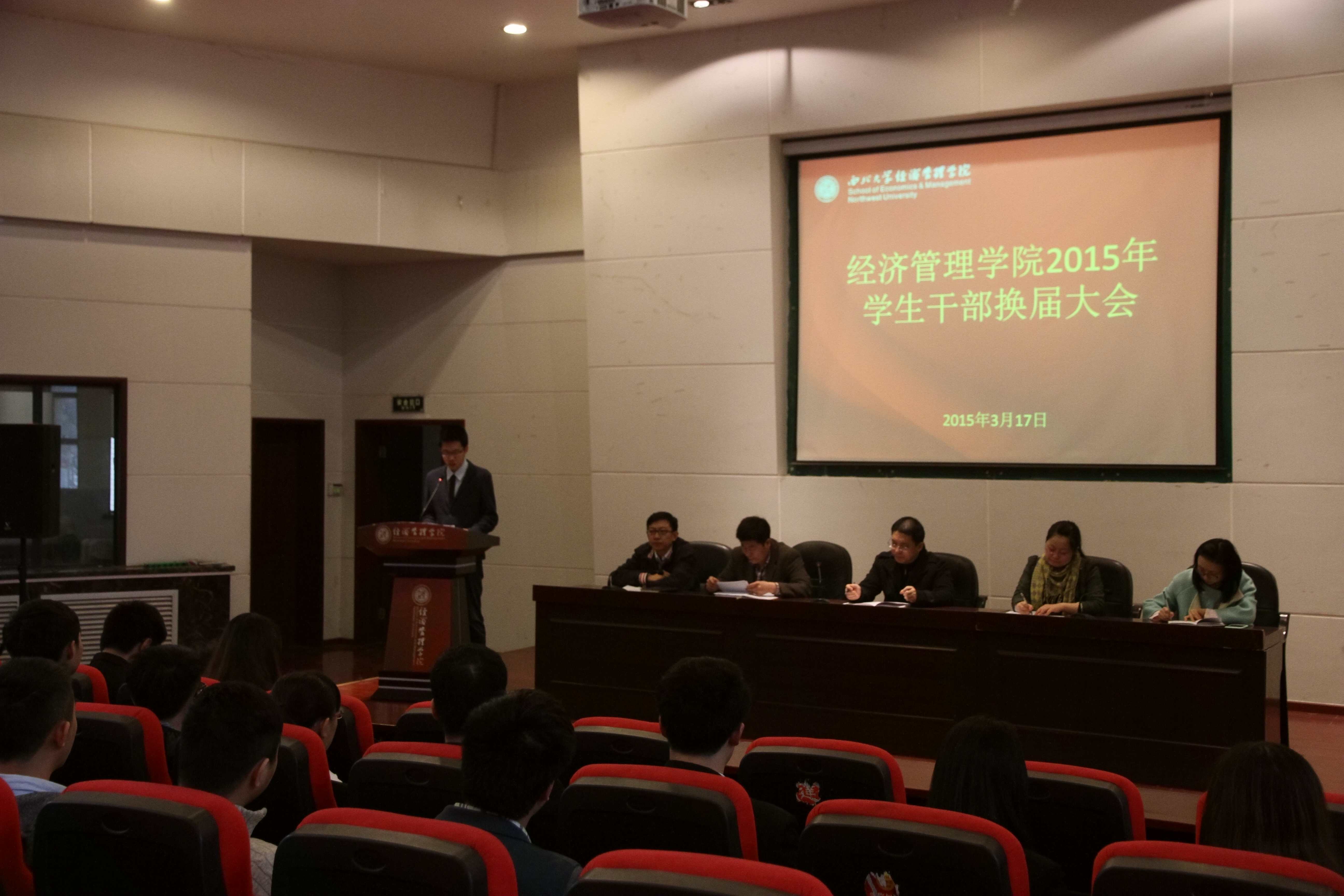 会上,院团委李若昕老师宣读了新一届学生干部名单,本次换届竞选面向全院研究生和本科生公开竞聘,学院各年级学生踊跃报名。3月11日下午,学院举行了竞选大会,院党委副书记李一凡,团委全体老师和上一届学生会主席团成员担任大会评委,最终,经过评委打分和评议,产生了新一届学生干部名单。之后,上一届学生会主席王超,院团委学生副书记郭润宇,研究生会副主席邓利亚分别作了工作总结,新一届院学生会主席李浩然,院团委学生副书记廉天远,研究生会主席王利彩作了就职演说。