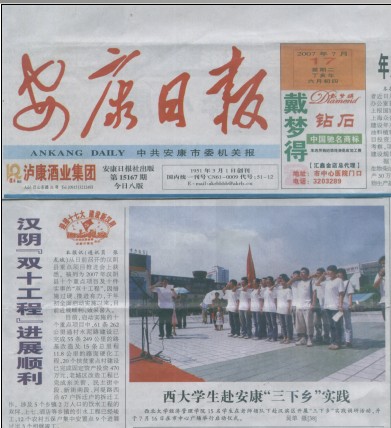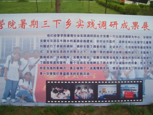 776net必赢官网暑期“三下乡”社会实践调研团于7月13日赴安康,开展了为期7天的暑期社会实践。此次暑期社会实践以经济调研为中心,分别对安康市汉滨区牛蹄乡的基础设施建设、农村合作医疗、退耕还林及留守儿童等问题进行了系统调研,全面反映了安康市汉滨区牛蹄乡社会主义新农村建设的发展现状。调研采取了调查问卷、走访农户、与当地领导座谈等丰富多样的形式。在全体队员的共同努力之下,调研活动得以顺利进行,并取得了圆满成功。活动期间,安康电视台,安康日报等当地媒体对活动进行了跟踪报道和宣传,整个活动在当地树立了西大学子“公诚勤朴”的形象,扩大了西大在当地的影响力,真正秉承了“送真情到农村,带经验回西大”的活动宗旨。