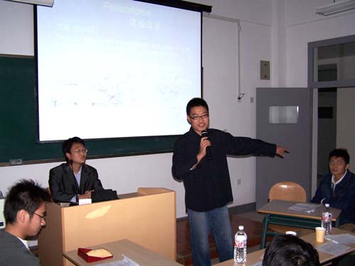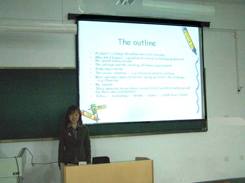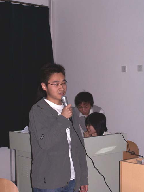 之后上场的是04级国贸般的冯赭同学,他的题目是“NET GAME“,他从经济角度分析了外国网络游戏发展的过程,同时他提出了国产网络游戏发展的方向,在他认为:网络游戏具有巨大的市场潜力,中国厂商应当迎头赶上。