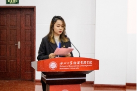 正式会议在庄严的国歌声中拉开序幕,院团委副书记史歌致开幕词。史歌老师向大会的召开表示热烈的祝贺,她代表学院团委向长期以来关心和支持我院学生发展的各位嘉宾和领导的到来表示热烈的欢迎和衷心的感谢。史歌老师表示,在学院党委的高度重视和学院团委的精心指导下,广大经管青年取得了许多令人值得骄傲的成绩。希望在未来的日子里,广大学生会干部积极进取,秉承西大校训,为学校“双一流”建设添砖加瓦,为中国特色社会主义伟大事业凝聚青春力量。