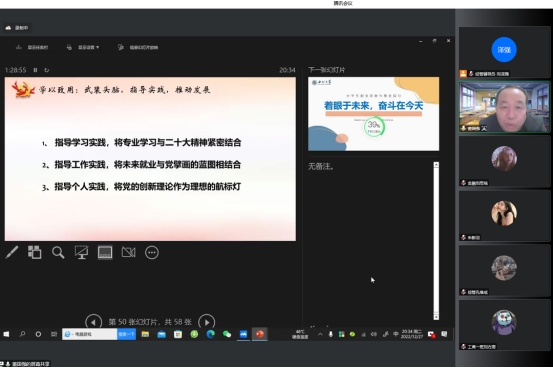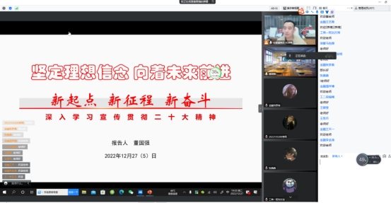 12月27日晚,776net必赢官网邀请学校党委统战部部长董国强老师通过腾讯会议走进2022级本科生形势与政策课堂,为同学们作了《坚定理想信念,向着未来前进》—二十大精神专题报告。报告由学院专职团干刘泽强主持。