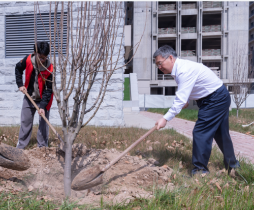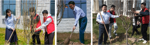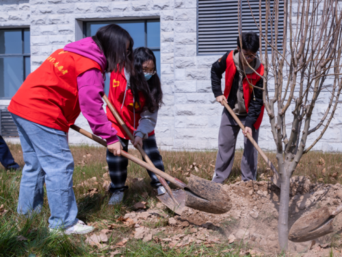 在习习的春风中,参与活动的师生们分工协作,整地挖坑、培实新土、扶正树苗、挥锹培土、提水浇灌,共同将一棵棵海棠成功栽植。现场不时响起师生们参加劳动的欢声笑语,讨论着来年的春天“楼前燕子飞,海棠香满园”的美好景象。