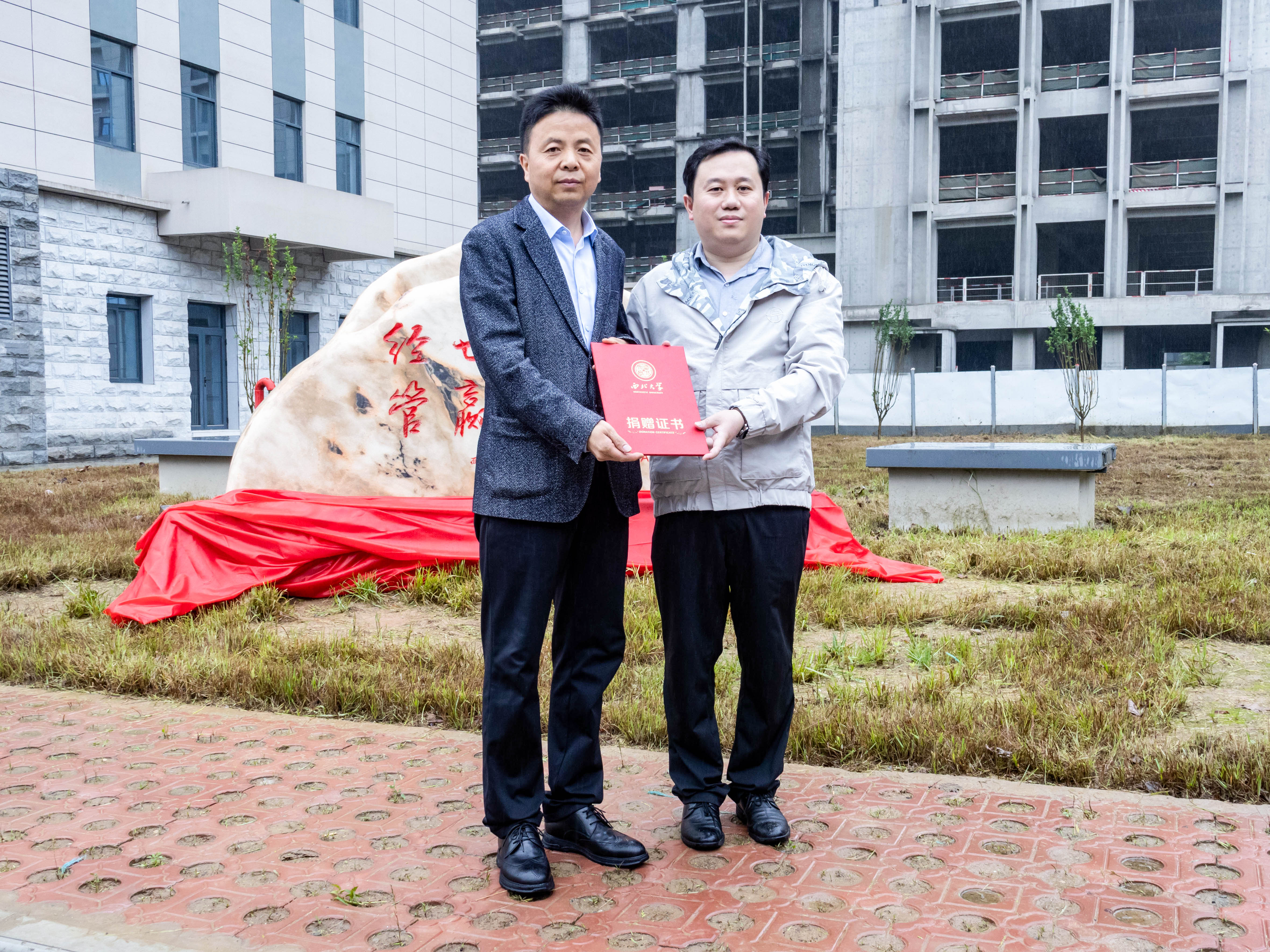捐赠仪式上,学院马莉莉院长和校友工作办公室主任吴丰华,MBA2031班学生代表董雪、秦立服共同为景观石揭幕,国内合作与校友工作处副处长燕来为MBA2031班颁发捐赠证书。
